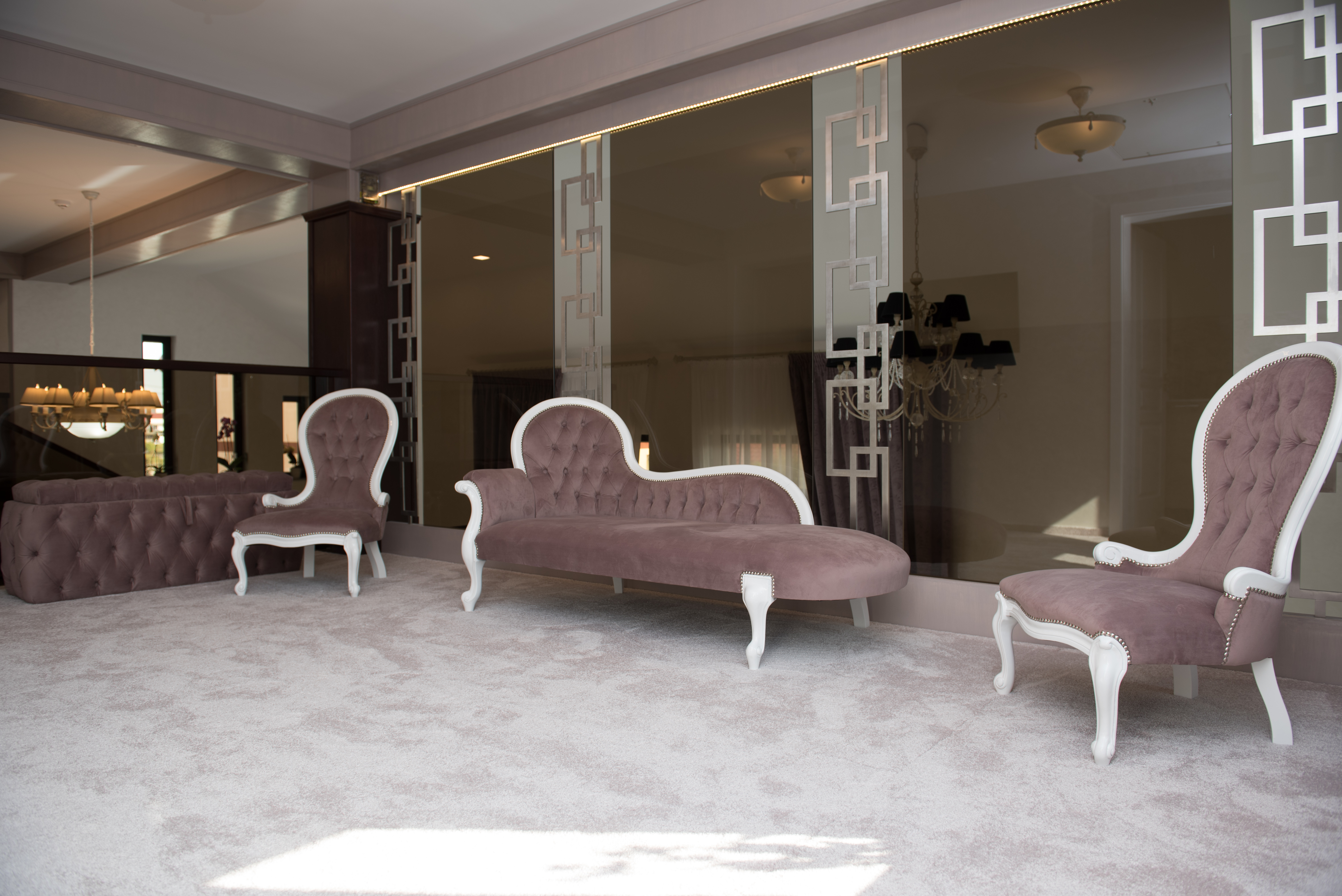 Un living cu piese de mobilier clasice cum ar fi canapele din catifea alba, marmura alba care da un plus de lux parterului casei, peretii imbracati cu boiserie din lemn masiv finisat in culoarea mahonului si textilele pretioase ale acestei amenajari transforma aceasta camera intr-un adevarat spatiu unde luxul, designul si rafinamentul s-au contopit.